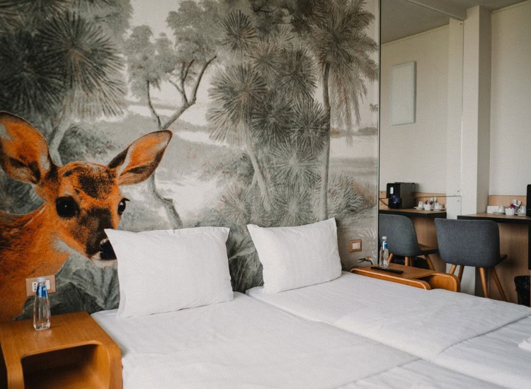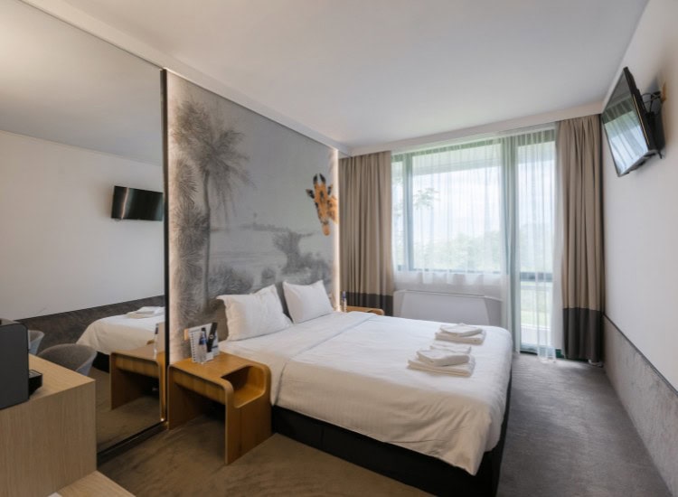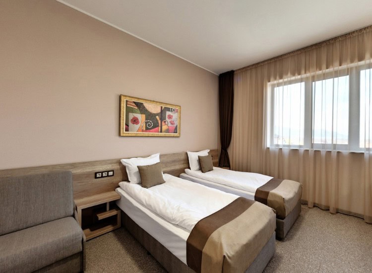 Двойната стая е чисто и уютно пространство със собствена баня и изглед към парка. Снабдена е с геотермален конвектор, WiFi, интерактивна телевизия, кафемашина с капсули и минерална вода. Имате възможност за доплащане за двойна стая с балкон и гледка към града.