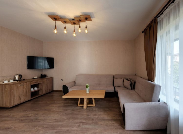 Апартаментът в къщите за гости включва спалня, всекидневна, веранда, разтегателен диван, мека мебел, климатизация и отопление, плазмен телевизор и самостоятелен санитарен възел с WC.